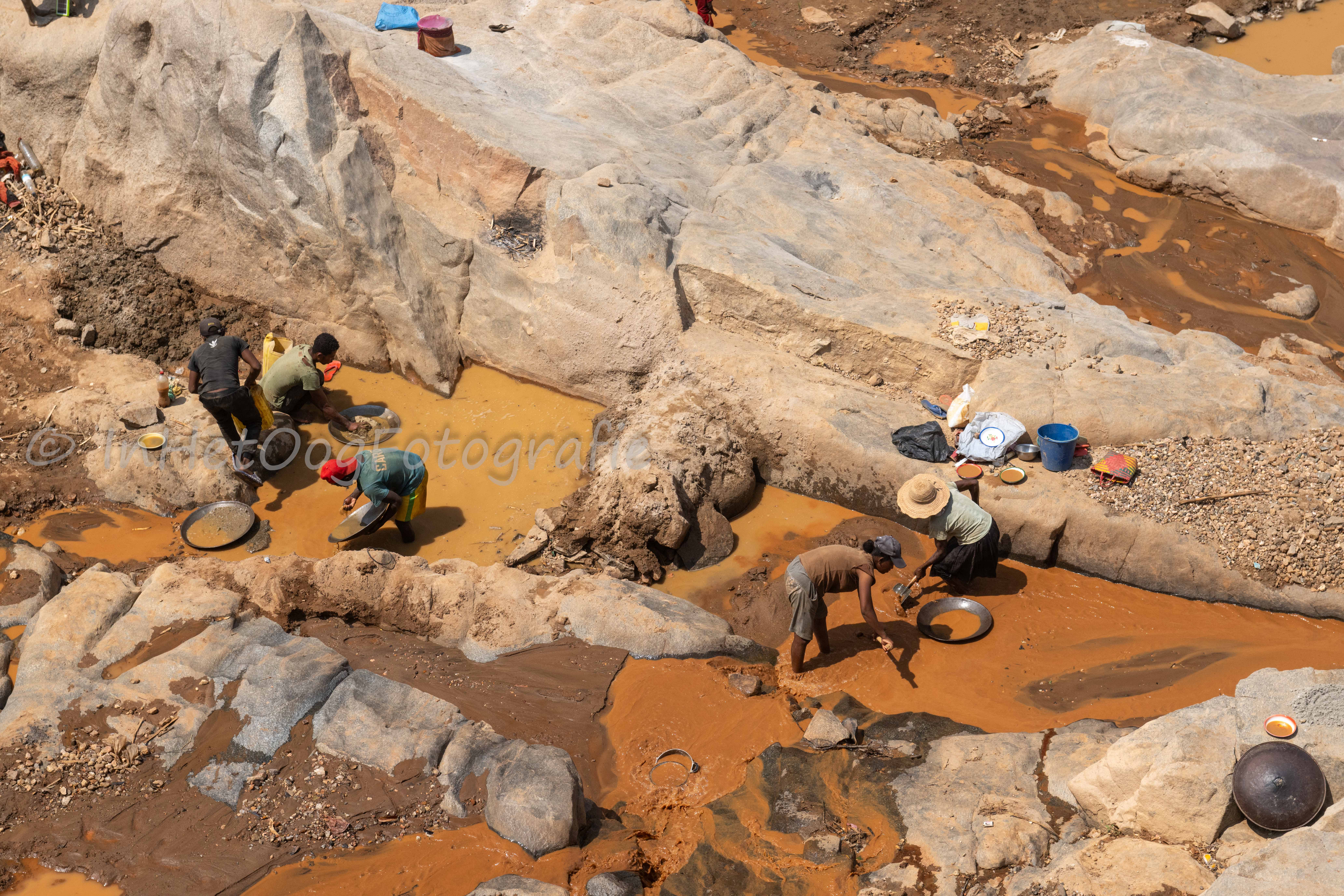 Goudzoekers die rotsen te lijf gaan met stalen pijpen, en anderen die alleen het slib zeven.